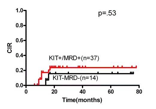 When receiving CT/auto-HSCT as postremission treatment, KIT+ patients (n=19) had a higher 3 year cumulative incidence of relapse (CIR) than KIT-patients (n=43) (94.4% vs. 38.2%, p<0.0001). Similar results also found in MRD+ (n=19) and MRD- (n=43) patients (CIR 92.9% vs. 46.6%, p<0.0001). Among KIT+ patients, a very high relapse rate was found in both MRD+ and MRD-patients (CIR, 100% vs.88.9%). However, among KIT-patients, MRD+ patients had a significant higher relapse rate than MRD-patients (CIR, 84.4% vs.26.3%, p=0.0006). When pooling KIT+ and or MRD+ into one group (KIT+/MRD+), this group had a significant higher relapse rate than KIT-MRD- group ( 94.4% vs. 26.3%, p<0.0001), However, the prognostic values of KIT and MRD was lost when patients received allo-HSCT (CIR of KIT+/MRD+ and KIT-MRD-, 23.8% vs. 15.6%, p=0.47). Similar results were also been found in disease-free survival (DFS) and overall-survival (OS). Multivariate analysis revealed that KIT+, MRD+, and treatment (allo-HSCT or CT/auto-HSCT) were three independent prognostic factors for relapse (all p<0.0001), DFS (all p<0.0001) and OS (p<0.0001, p<0.0001, p=0.007).