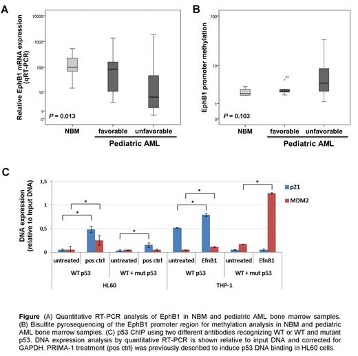 In this study, we found a common downregulation of EphB1 mRNA that was significantly associated with an unfavorable prognosis in pediatric AML. The downregulation of EphB1 could be explained by EphB1 promoter hypermethylation in a subset of AML samples. Downregulation of EphB1 was found to be one of the mechanisms through which AML cells suppress p53 DNA binding that impairs the DNA damage control system to support a proliferative and anti-apoptotic AML cell survival advantage.