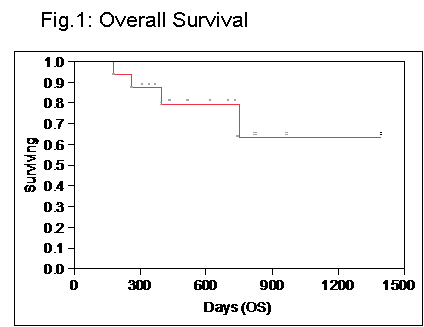 The 2-year Kaplan-Meier estimate of overall survival (OS) is 72% (95% CI, 45 – 91%). The cumulative incidence of TRM was 12.6% (95% CI 3.9%-34%) at 1 year.