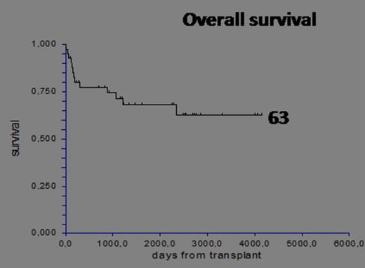 There was no influence on tri-lineage recovery of the following factors : dose of CD34 cells (</> 3.3) (78% vs 72%), nor patient age (</>35 years) 75% vs 76%, nor donor type (HLA id sib 83%, UD 79%, family mm 68%). All the patients who achieved tri-lineage recovery are alive and disease free (28/41 patients). In this cohort 13 patients died due to relapse 9/14 (64%) or GVHD 2/14 (14%) or other causes 2/14 (14%). The overall actuarial survival is 63% with a median follow up of 1245 days (94-4151 days).