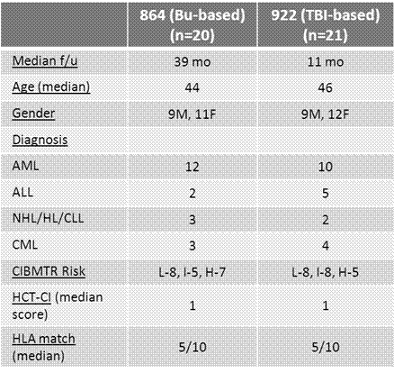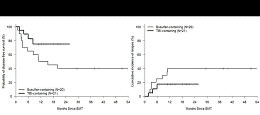 Lack of a matched sibling or suitably matched unrelated donor can be a significant barrier to allogeneic hematopoietic cell transplantation in patients who stand to benefit from this procedure. HLA-haploidentical donors are readily available for nearly all such patients. Whereas previous attempts at haploidentical donor hematopoietic stem cell transplantation (haploSCT) using standard immunosuppression or ex-vivo T-cell depletion have had relatively poor outcomes, a recent approach using a T-replete bone marrow graft with non-ablative conditioning and post-transplant cyclophosphamide (ptCy) for control of alloreactivity has proved to be remarkably well tolerated (Luznik et al BBMT 2008). However, relapse of malignancy remains a major challenge with the use of this non-myeloablative regimen. The use of myeloablative conditioning and a PBSC graft may help reduce the relapse rate following T-replete haploSCT but this has not been well studied. We enrolled a total of 41 patients on two consecutive prospective phase II trials of myeloablative haploSCT and ptCy using a T-replete G-CSF mobilized PBSC graft. The first trial (NSH 864) employed a high-dose busulfan-based preparative regimen (fludarabine 30 mg/m2/d d-6 to -2, Busulfan 110-130 mg/m2/d d-7 to -3 , Cy 14.5 mg/kg/d d-6&-5) [n=20], the second (NSH 922) utilized a TBI-based regimen (fludarabine 25 mg/m2/d x 3 d and TBI 150 cGy bid on d -4 to -1 [total dose 1200cGy]) [n=21]. Post-grafting immunosuppression consisted of Cy 50mg/kg/day on days 3 and 4, MMF through d 35, and tacrolimus through d 180 on both protocols. Eligibility was limited to patients ≤60 years of age with aggressive/advanced hematologic malignancies perceived to be at high risk of relapse following nonmyeloablative transplant. Leukemia patients in CR1 were eligible if they had either poor-risk cytogenetics/molecular studies or primary chemoresistance. Median patient age was 45 years (range 24-60). Twenty-five patients were transplanted in complete remission (CR) or in chronic phase (CP), while 16 patients were transplanted with advanced disease. No patient experienced graft failure, with a median time to neutrophil and platelet recovery of 16 and 25 days, respectively. All evaluable patients achieved sustained complete donor T cell and myeloid chimerism by Day +30. Median follow-up for survivors is 20 months (NSH 864 - 39 months; NSH 922 – 11months). The cumulative incidence of grades II-IV and III-IV acute GVHD at day +100 was 30% and 17% respectively. The cumulative incidence of chronic GVHD at one year post transplant was 41% (severe in 9%). Non-relapse mortality (NRM) at 12 and 24 months was 8% and 17% respectively. Cumulative incidence of relapse was 31% at both 12 and 24 months post-transplant. The relapse rate was lower in patients transplanted in CR/CP (18%) vs. those transplanted with advanced disease (49%, p=0.044). BK virus-associated hemorrhagic cystitis (HC) occurred in 56% of patients, and was severe (requiring hospital admission for bladder irrigation and/or pain management) in 19%. The incidence of HC and severe HC was significantly lower in patients receiving TBI-containing conditioning than those receiving Busulfan (38% vs. 75%, p=0.028 and 10% vs. 30%, p=0.13, respectively). With a median follow-up of 20 months, the estimated 2 year overall survival (OS) was 51% with a 52% estimated disease-free survival (DFS). In patients transplanted in CR/CP, 2-year DFS was 64% vs. 35% in patients transplanted with advanced disease (p=0.077). There was an encouraging trend to better 2-year DFS in patients receiving TBI-based conditioning than those receiving Busulfan, 75% vs. 40%, p=0.072. Myeloablative haploSCT with PBSC grafts and ptCy allows reliable engraftment with early donor T cell chimerism; low rates of GVHD, infectious complications, and NRM; and promising survival in patients with high-risk hematologic malignancies. Outcomes are particularly good in patients treated in CR/CP (18% relapse, 64% DFS). When compared with Busulfan-based conditioning, TBI-based conditioning is associated with less risk of HC and improved DFS. Myeloablative haploSCT is a valid option for patients with aggressive/advanced hematologic malignancies who lack timely access to a conventional donor.