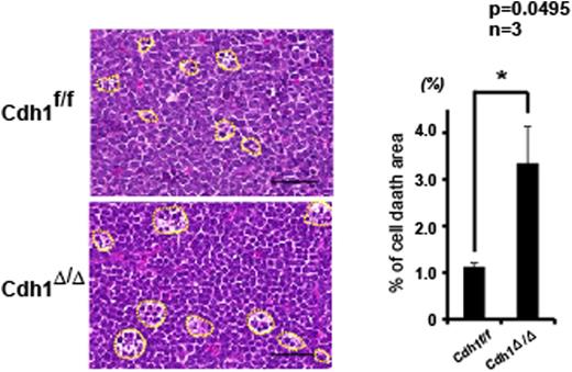 The survival of Cdh1-deficient B-ALL/LBL mice was slightly, but statistically significantly longer than the Cdh1-intact mice (median survival: 78 days versus 95 days in the Cdh1-deficient group; p = 0.0064, n = 14 and 9, respectively). In addition, histologic sections of affected lymph nodes showed more prominent “starry sky” pattern (focal cell death area) in the Cdh1-deficient group (Fig. 1, %area; 1.126 ± 0.083 versus 3.353 ± 0.788, p < 0.05, n = 3 for each), indicating that the cell fragility probably causes the better prognosis in this group. Furthermore, TUNEL-negative dead cells were observed in the Cdh1-deficient mice, suggesting non-apoptotic cell death.