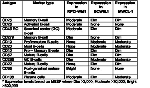 A comprehensive flow cytometric surface antigen analysis was performed using the BCWM.1, MWCL-1 and RPCI-WM1 cell lines. Surface antigens present on progenitor, immature, activated germinal center and memory B-cells along with those present on plasmablasts and plasma cells were examined. Presence of stem cell markers was also examined. Briefly, antibodies for CD5, 10, 11c, 13, 14, 16, 19, 20, 22, 23, 24, 25, 27, 28, 30, 32, 34, 35, 38, 39, 40, 43, 45, 45RA, 45RO, 52, 54, 56, 62L, 66b, 69, 70, 73, 79b, 80, 86, 90, 101, 105, 110, 111, 117, 123, 127, 133, 134, 135, 137, 138, 154, 184, 197, 202b, 243, 252, 268, 272, 278, 279, 309, 338, FMC7, HLADR, Kappa and Lambda were utilized. Antibodies for determining presence of intracellular CD247, 289, Kappa and Lambda were also used.