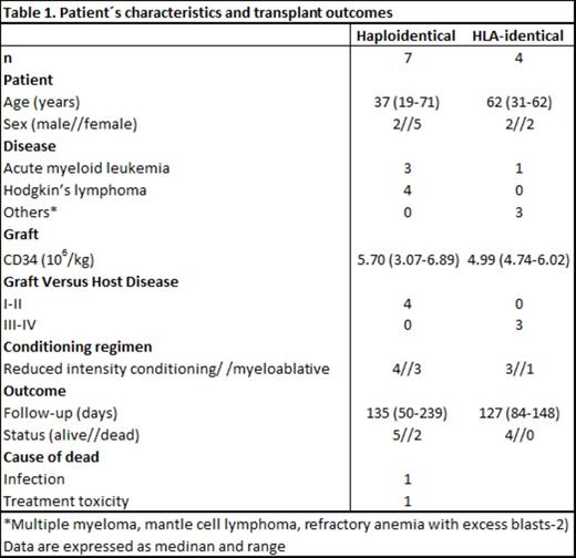 11 adult patients received SCT (7 Haplo and 4 HLA-id) at Gregorio Marañón Hospital (Madrid-Spain) from November 2012 to April 2013. Conditioning regimen comprised fludarabine, cyclophosphamide and busulfan for Haplo SCT and fludarabine and busulfan or fludaribine and melphalan for HLA-id SCT. Prophylaxis for acute graft-versus-host disease consisted of high dose cyclophosphamide on days +3 and +4, cyclosporine A and mycophenolate mofetil for Haplo and Cyclosporine A and methotrexate for HLA-id. Patient´s characteristics and transplant outcomes are shown in table 1. We analysed reconstitution patterns and phenotype of NK at day +15, +30, +60, and +90 after transplantation by multi-color flow cytometry on FC500 Beckman Coulter® cytometer using the following anti-human monoclonal antibodies: CD3 FITC, CD56 ECD, CD45 PC7, NKG2A PC7, NKp30 PC5, NKp44 PE, Nkp46 PC5, and NKG2D PE (Beckman Coulter®). For comparison between the two groups Mann–Whitney U-test was used.