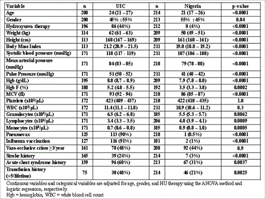 The lower height and low proportions of vaccination among the Nigerian SCA patients point to the need for improved nutrition and vaccination strategies, and the low utilization of hydroxyurea therapy highlights the need to investigate the appropriateness of this agent in the African context. On the other hand, the higher values for BMI and blood pressure in the UIC compared to Nigerian SCA patients parallel similar findings in non-sickle cell cohorts and raises the possibility that life-style factors may contribute to the higher rate of stroke in the UIC cohort. Whether the lower rate of complications in general in the Nigerian SCA patients reflects higher early mortality versus favorable genetic or environmental factors deserves further investigation. In summary, our study found both differences and similarities between patients with SCA from Nigeria and the U.S. and a better understanding of the genetic and environmental contributions may help guide future therapies for SCA in both settings.