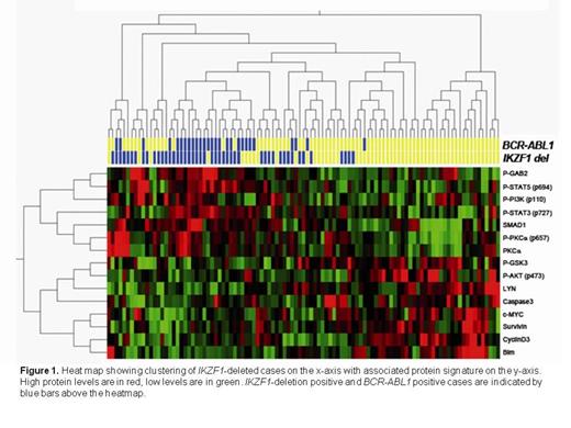 A cohort of 91 precursor B-ALL cases treated at M.D. Anderson Cancer Center in Houston, USA, including 82 newly diagnosed cases and 5 diagnosis-relapse pairs was used for this study. The cohort consisted of 6 children (age 1-6), 30 young adults (age 15-39) and 45 adults (age>39), and 20 patients carried a BCR-ABL1 chromosomal translocation. Copy number alterations in eight genes frequently deleted in ALL (IKZF1, PAX5, EBF1, RB1, CRLF2, CDKN2A/2B, BTG1, and ETV6) were determined by multiplex ligation-dependent probe amplification analysis. IKZF1 deletions were associated with relapse (Pearson's chi-square test, p=0.009), and the presence of BCR-ABL1 translocation (p=0.032). Protein expression and modification levels were determined by probing Reverse Phase Protein Arrays (RPPA) containing protein lysates of all above samples with 128 rigorously validated antibodies including 34 phospho-specific antibodies. Hierarchical clustering analysis was used to determine which (phospho)proteins are differently expressed in genetic subsets of ALL. The significance of correlations was determined using two-sample t-test, with correction for multiple testing (Beta-Uniform Mixture model).