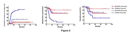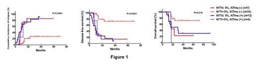 The median follow-up time was 25 (6-93) months for 73 alive patients. The cumulative incidence of relapse (CIR) at 3 years was 35.3%. The 3-year disease free survival (DFS) and overall survival (OS) rates were 57.2% and 62.8%, respectively. The median WT1 transcript levelsssof all patients were 9.1% (0.02%-99.3%). c-KIT mutation was detected in 31 patients. Receiver operating characteristics (ROC) curves revealed that WT1 transcript levels of 5.0% (1-log increase compared to the upper limit of NBM) were the best cutoff values to discriminate patients with different outcome. WT1 transcript levels of ≤5.0% were significantly associated with c-KIT mutation (23/42 vs 8/59, P<0.001), but didn't related to other pretreatment parameters (all P>0.05). In CT group, patients with WT1≤5% (n=19) had significantly higher CIR rate at 3-year, lower 3-year DFS and OS rate than those with WT1>5% (n=38), respectively (89.5% vs 27.9%, P<0.0001; 10.5% vs 66.1%, P<0.0001; 28.5% vs 66.5%, P=0.0062). Furthermore, patients with WT1≤5% and c-KIT mutation (-) had similar CIR, DFS and OS rate to both patients with WT1≤5% and c-KIT mutation (+) and patients with WT1>5% and c-KIT mutation (+) (all P >0.05, Figure 1). Therefore, they were merged into one group (n=24). Thus, patients with WT1≤5% and/or KIT mutation (+) had significantly higher CIR rate at 3-year, lower 3-year DFS and OS rate than those with WT1>5% and c-KIT mutation (-) (n=33) in CT group, respectively (89.4% vs 27.4%,P<0.0001; 10.6% vs 72.6%, P<0.0001; 26.1% vs 72.2%, P=0.0013). For patients ith WT1≤5%, allo-SCT significantly lowered CIR rate at 3-year, improved 3-year DFS rate and tended to improve OS rate compared to chemotherapy/auto-SCT by landmark analysis, respectively (11.5% vs 88.2%, P<0.0001; 65.4% vs 11.8%, P=0.0001; 60.6% vs 32.6%, P=0.10. Figure 2). Multivariate analysis revealed that WT1 transcript levels (≤5% vs >5%) and treatment (chemotherapy/auto SCT vs allo-SCT) instead of other pretreatment parameters were independent prognostic factors for relapse (hazard ratio (HR) 0.20, 95% CI 0.093¨C0.44; 0.096, 95% CI 0.033¨C0.28. all P<0.0001) , DFS (HR 0.22, 95% CI 0.11¨C0.44; 0.23, 95% CI 0.11¨C0.49. all P<0.0001) and OS (HR 0.30, 95% CI 0.14¨C0.66, P=0.003; 0.37, 95% CI0.16¨C0.82, P=0.014).