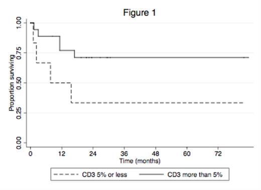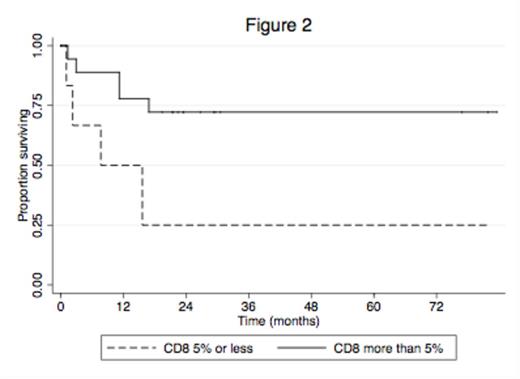 26 evaluable patients (15 female; 11 male; Age range 23-90 years) were identified. Median follow up was 26 months. 7 patients were in 1st complete remission (CR1); 4 patients were in 2nd CR; 2 patients had stable disease; 9 patients were deceased; 4 patients were lost to follow up. 3/18 patients tested were positive for FLT3 ITD (2 in CR; 1 deceased). 5/14 patients tested were positive for NPM1, of which 1/5 was also FLT3-ITD positive (2 in CR; 3 deceased). Prominent non-specific background staining prevented CD4 analyses. The mean staining scores for CD3 and CD8 were 16% and 11%, respectively. Six patients (23%) in each of the CD3 and CD8 groups scored =<5% staining, where 5 of these respective 6 patients scored =<5% for both CD3 and CD8. Analyses for both CD3 and CD8 stains at >5% vs =<5% showed a trend for increased survival with estimated 3-year survivals of 71% vs. 33%, p=0.054 and 72% vs. 25%, p=0.027, respectively (Figures 1 and 2). The median for Granzyme B stain was 1% and when analysed at >1% vs =<1%, also showed improved survival, although this was not statistically significant (69% vs. 53%, p=0.317).
