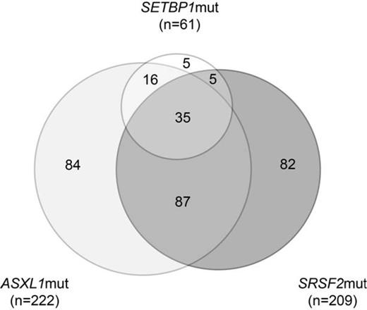 Mutations in SETBP1 associate with ASXL1mut and SRSF2mut and are frequently found in patients with i(17)(q10) or -7. This combination of genetic lesions occurs in different myeloid entities and might therefore define a specific genetically defined subtype of myeloid malignancy.