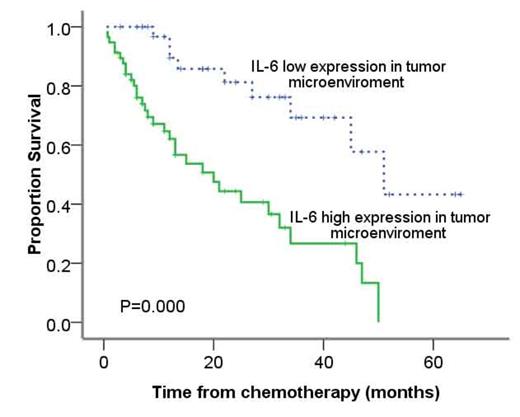 Overall, ninety-one patients with NK/TCL were analyzed. There were 68 male patients. The median age was 43 years (range 10-68 years). There were 52, 14 and 25 patients diagnosed as stage I, II and IV disease, respectively. Sixty-one patients had B symptoms. The P52 activation was observed in the microenviroment of most patients, while P65 and P50 activation were observed in minority of patients. In patients with P52 activation, P52 activation was observed both in macrophages and lymphoma cells, and vice versa. IL-6 was primarily secreted by macrophages and tumor cells, and 69.2% (63/91) patients were positive (IL-6 secreting cells ≥ 10 / HP). The STAT3 activation was observed in 67.0% (61/91) of patients, most of which were combined with expression of BCL-2. The expression of P52、IL-6、P-STAT3、bcl-2 in the microenvironment of NK/TCL were in uniform (all positive or all negative). Patients with positive expression of IL-6 were associated with fever, advanced stage, high serum level of C-reactive protein (CRP), chemotherapy resistance and poor survival (P < 0.05). Comparing with blank control group and the neutralizing IL-6 antibody group, the cell viability and antiapoptosis ratio of NK-YS、 SNK-6、SNT-8 cells were higher in the IL-6 group (P<0.05). Constitutive activation of p-STAT3, BCL-2, BCL-XL, MCL-1, and survivin were observed in the NK/TCL cell lines. IL-6 could up-regulate the expression of these proteins. The expression of p-ERK and p-AKT were irrelevant with IL-6 or IL-6 antibody treatment.