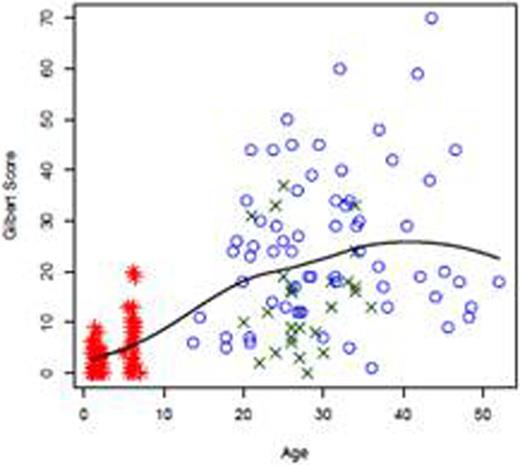 The 3 studies included the Joint Outcome Study [NEJM;357:535] and the JOS Continuation Study (JOSc), the Spinart Study baseline results [JTH;11:1119] and a Cross-Sectional MRI study [Haemophilia;189 Suppl3:117]. The 3 studies provide data on 275 individuals aged 1 to 50 years. Clinical, Gilbert and MRI data were extracted and analyzed from multiple joints in each of 157 individuals who were receiving on-demand treatment only. The median age was 21 (range 1 – 50), and across all studies the median number of bleeding episodes in the prior 12 months was 18 (range 0 to 82). The rate of change in outcomes as a function of age is shown in Table 1 and Figure 1. The number of bleeding episodes was approximately constant at 20 bleeding episodes per year regardless of age (Figure 1a; p = 0.72 for relationship with age). Gilbert scores showed a steeper rise in young patients but did not increase after the late teens (Figure 1b; change of 0.34 Gilbert points/year of life, p=0.07).