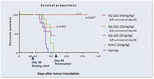 AG-221 is a potent and selective inhibitor of the IDH2 mutant enzyme and is currently being evaluated in a first-in-human study entitled: A Phase 1, Multicenter, Open-Label, Dose-Escalation, Safety, Pharmacokinetic, Pharmacodynamic, and Clinical Activity Study of Orally Administered AG-221 in Subjects with Advanced Hematologic Malignancies with an IDH2 Mutation. The compound has been demonstrated to reduce 2-HG levels by >90% and reverse histone and deoxyribonucleic acid (DNA) hypermethylation in vitro, and to induce differentiation in leukemia cell models. We evaluated the efficacy of AG-221 in a primary human AML xenograft model carrying the IDH2 R140Q mutation. This is an aggressive model with mortality from AML consistently occurring by day 80, following tail vein engraftment. Results show that AG-221 is able to potently reduce 2HG found in the bone marrow, plasma and urine of engrafted mice. Treatment also induced a dose dependent, statistically significant, survival benefit where all mice in the high dose treatment group survived to the end of study. We also saw a dose dependent proliferative burst of the human specific CD45+ blast cells followed by cellular differentiation as measured by the expression of CD11b, CD14 and CD15 and cell morphology. Furthermore, the onset of differentiation correlated with survival, whereas mice that died in the low dose groups failed to show signs of cellular differentiation. These data provide strong preclinical in vivo evidence that AG-221 may have clinical benefit for IDH2 mutant patients through the reduction of 2HG and the induction of blast differentiation.