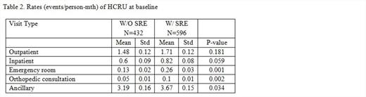 MM patients with SRE (n=596, mean age=67.8, 45.6 % male, mean Charlson/Deyo [CD] =1.1) were compared to MM patients without SRE (n=432, mean age=65.7, 47.5 % male, mean CD=0.8). Patients are categorized by number of SREs experienced during the study period in Table 1. MM patients with SRE experienced significantly greater HCRU during both the baseline and post-index periods (Tables 2 &3). The HCRU increases translated into mean total costs for patients with SRE that were significantly greater during both the baseline (w/o SRE: USD 953; w/SRE: USD 1328; p=0.005) and post-index (w/o SRE: USD 3307; w/SRE: USD 4763; p<0.0001) periods. Increasing frequency of SRE was significantly associated with increasing trend of HCRU and cost throughout the study (all p values <0.0001).