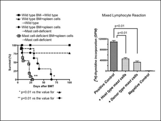 Originally mast cells have been known as effector cells in the IgE-mediated allergic responses. In addition, recent studies demonstrated that mast cells exerted pro-inflammatory or anti-inflammatory effects in complicated immune response depending on the situation. In allogeneic hematopoietic stem cell transplantation (HSCT), exact role of mast cells in graft-versus-host disease (GVHD) remains unclear. First we investigated whether host mast cells protect acute GVHD or not in a murine HSCT model using mast cell deficient mice. When lethally irradiated wild type (WT) B6 or mast cell deficient mice were transplanted with bone marrow cells and spleen cells from WT Balb/c mice, mast cell deficient B6 host mice showed significantly lower survival rate than WT B6 mice (p<0.01) due to acute GVHD. Moreover when irradiated mast cell deficient host mice (B6 derived) were given BM cells and splenocytes from mast cell deficient Balb/c mice, these mice died much faster compared to the mice receiving WT BM plus splenocytes (p<0.01) as shown below. Next, we demonstrated that bone marrow derived cultured mast cells (BMCMCs) inhibited mixed lymphocyte reaction (MLR) in a dose-dependent manner, when added to the coculture (Stimulator: dendritic cells (DCs) from B6, Responder: spleen cells of Balb/c, BMCMCs from B6). In addition when mast cells generated from the same strain of responder cells (Stimulator: DCs from B6, Responder: spleen cells from Balb/c, BMCMCs from Balb/c) were added to the MLR mixture, MLR was also suppressed even in this condition. Taken together, we have clearly demonstrated that both host-type and donor-type mast cells suppressed alloreaction in vivo and in vitro. However when we used anti-CD3 and anti-CD28 monoclonal antibodies to stimulate T-cells instead of DCs, BMCMCs could not suppress the lymphoproliferation any more. It suggested that mast cells could suppress MLR via the regulation of DCs directly, not T-cells. Next we have shown that BMCMCs dominantly regulated the alloreaction in a cell contact-dependent manner by using transwell system, though mast cells contain many kinds of substances to regulate immune reactions such as IL-10. DCs highly expressed costimulatory molecules such as CD80, CD86, CD40, I-A, however expression level of these molecules was not changed during coculture of BMCMCs and DCs. Finally, we compared the MLR suppression rate between naïve and activated BMCMCs using IgE and specific antigens, however no difference was observed between them. In conclusion, both host and donor-type mast cells have a protective role against acute GVHD.