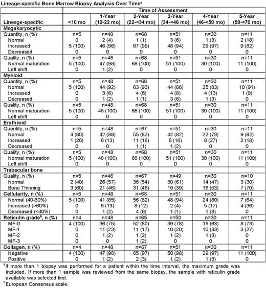 Cellularity was normal in the majority of patients at each assessment timepoint. Most (82-99%) patients demonstrated megakaryocytic hyperplasia. Megakaryocyte morphology was normal in all patients in all years except for 1 patient in year 1. Seven patients (6%) had megakaryocytes reminiscent of those seen with polycythemia vera or essential thrombocythemia. Erythroid hyperplasia was observed in 13-27% and myeloid hyperplasia in 6-13% of patients. Trabecular bone thinning was found in 39-70% of patients over the 5-year observation period. No pathologic pattern of changes was identified among the on-treatment specimens.