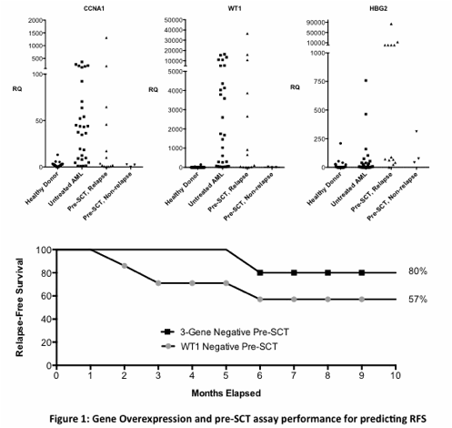 De-identified, clinically annotated peripheral blood samples from AML patients who had received allogeneic, non-myeloablative, T-cell depleted SCT from 2004 -2012 collected under IRB-approved protocols at the National Institutes of Health Clinical Center were studied. Expression of 11 genes was assessed using our custom-designed qRT-PCR array, normalized to ABL1 expression and analyzed using the comparative ddCT method After excluding one outlier for each gene, the threshold for positivity was set as the upper limit observed in ND controls. In serial samples, molecular relapse was defined as new gene overexpression seen on two consecutive time-points with the time of relapse defined as first detection of elevation plus 7 days to allow for retesting.