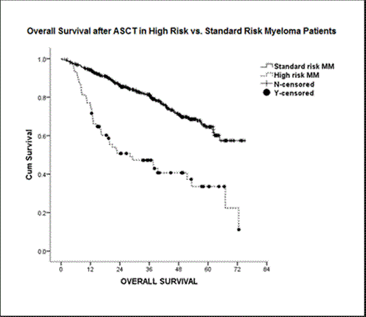 HR-MM pts are characterized by higher bone marrow plasma cell burden, concurrence of high-risk chromosomal abnormalities, and poor response to induction or high dose chemotherapy followed by ASCT as compared to SR-MM pts. In HR-MM pts, having only 1-high risk cytogenetic abnormality or achieving at least VGPR with ASCT are independent factors associated with improved survival.