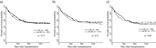 Although OS with iv-BU and oral-BU at day 100 after HSCT was 72.5 ± 3.2% and 66.9 ± 2.9%, respectively, OS at 3 years after HSCT was similar (iv-BU, 53.4 ± 3.7%; oral-BU, 55.1 ± 3.1% ), and the log-rank test for OS did not show statistically significant difference (p = 0.77) (Figure 1a). The result was concordant even when an analysis was limited to patients with ALL or AML. OS at 3 years for patients with ALL using iv-BU (n = 90) and oral-BU (n = 151) was 56.4 ± 5.5% and 54.6 ± 4.1, respectively (p = 0.51) (Figure 1b). OS at 3 years for patients with AML using iv-BU (n = 108) and oral-BU (n = 111) was 51.0 ± 5.0% and 55.8 ± 4.8%, respectively (p = 0.83) (Figure 1c).