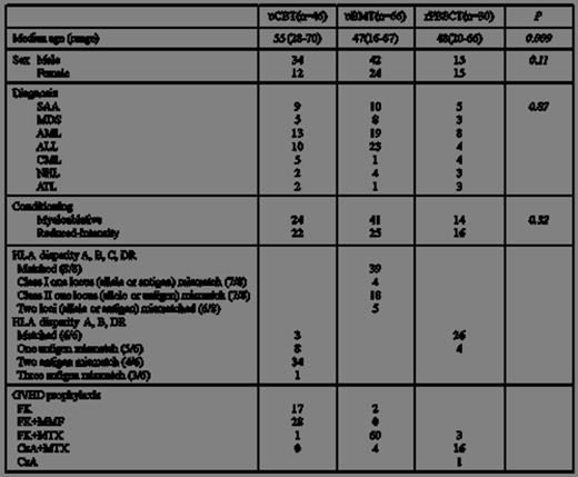 Cord blood has become one of the major alternative donor sources for those who lack identical related donors in recent years. In Japan, an annual number of unrelated cord blood transplantation (uCBT) has been increasing and it reached 1179 cases in 2012, which is comparable to those of unrelated bone marrow transplantation (uBMT) and related peripheral blood stem cell transplantation (rPBSCT). So far, there is still limited data available on the comparative outcomes of adult standard risk patients receiving uCBT, uBMT and rPBSCT.