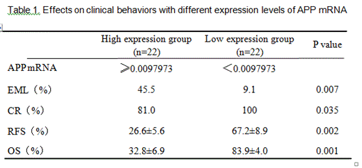 44 cases of AML1/ETO+ AML patients with median age of 29 years old, who were admitted to our hospital from February, 2006 to February, 2012 and made the diagnosis according to WHO2008 diagnosis standard, and had completed conventional induction, consolidation and intensive therapy, were investigated in this study. They were divided into high expression group (n=22) and low one (n=22) according to APP mRNA median expression level from bone marrow cells before the first chemotherapy by QRT-PCR. Some of bone marrow samples were checked by Western Blot, and 5 biopsy specimens from extramedullary infiltration were tested by APP antibody immunohistochemistry staining. Incidence of extramedullary leukemia (EML), complete response (CR), overall survival (OS), and recurrence free survival (RFS) was differentiated between the two groups. Differences of cell ultrastructure, migration, proliferation, apoptosis and expression of ERK, MMP-2, MMP-9 and CXCR4 were studied on Kasumi-1 cell line between wild, negative control (NC) and si-APP group in which the expression levels of APP gene were down regulated with application of siRNA technology.Çå