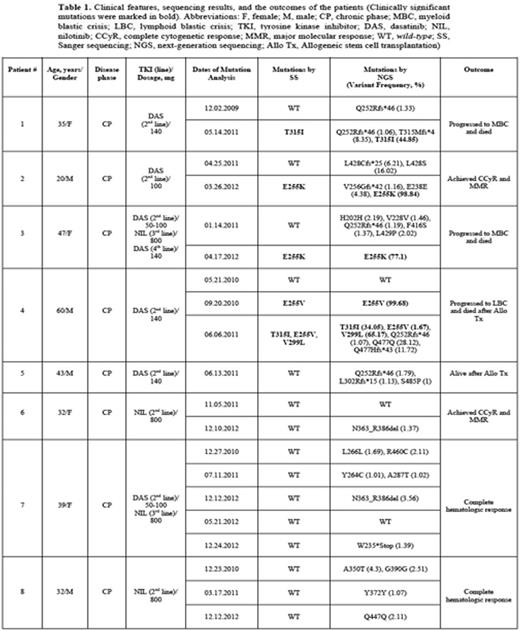 Clinical features, sequencing results, and the outcomes of the patients were summarized in Table 1. Four patients were male, and the median age was 37 years (range, 20-60 years). The patients were all in chronic phase at the time of the diagnosis. After imatinib resistance, 4 patients had received dasatinib (DAS), and 2 were given nilotinib (NIL) as second line TKI treatment. The remaining two patients had both received DAS and NIL (Table 1). In a set of 20 clinical samples, at different time points, NGS not only identified all the mutations detected by SS, but additionally identified low level variants present between 1 – 28.12 %. T315I and E255K/V were the most common mutations, which were detected in four patients, both by SS and NGS at the same time points (Table 1). Two patients (patient #1 and #4) had T315I, and they both progressed to blastic phase and died. E255K was detected in patients #2 and #3, and patient #2 had achieved and maintained complete cytogenetic and major molecular responses with 100 mg daily DAS, whereas patient #3 had received both NIL and DAS, but she was deceased due to myeloid blastic crisis. Among 4 patients (patients #5, #6, #7, and #8), mutation analysis was performed at eleven different time points, and these patients were wild-type with SS. We also did not detect any clinically significant mutations in these patients by NGS. Most probably mechanisms other than KD mutations were responsible for the TKI resistance among these four patients.