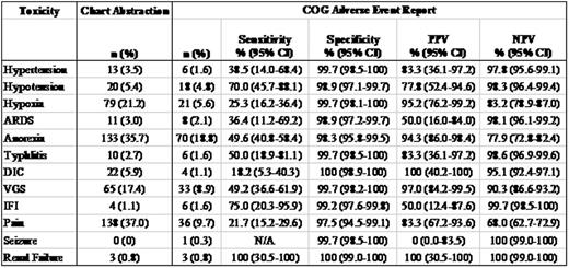 Chart abstraction was performed by a single pediatric oncologist on patients enrolled on COG clinical trial AAML0531 at 5 hospitals in the United States. Presence or absence of the following 12 grade III or higher AEs was determined for each hospital day: hypertension, hypotension, hypoxia, adult respiratory distress syndrome (ARDS), anorexia, typhlitis, disseminated intravascular coagulation (DIC), microbiologically proven viridans group streptococcal bacteremia (VGS), microbiologically proven invasive fungal infection (IFI), pain, seizure, and acute renal failure. The definitions for the gold standard of chart abstraction were defined a priori. Using the daily AE assessments based on chart review, the presence or absence of each toxicity was determined for each chemotherapy course. These data were then merged with COG adverse event data that includes grade III or higher toxicities for each patient by chemotherapy course. The percentages of chemotherapy courses with each toxicity were determined for chart abstraction and COG data. Sensitivity, specificity, PPV and NPV for COG AE reporting of the 12 toxicities were determined by comparing to the gold standard of chart abstraction data. Age, gender, race and ethnicity were determined from COG data.