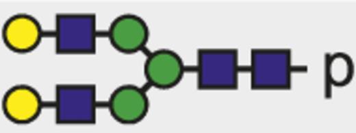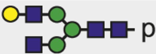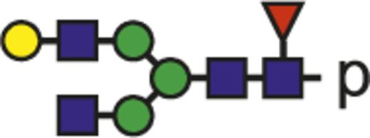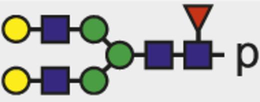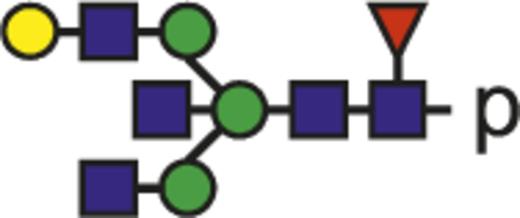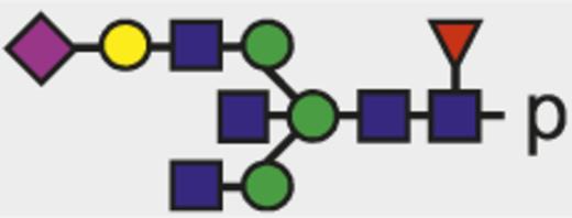 Blue square indicates N-acetylglucosamine; green circle, mannose; yellow circle, galactose; purple diamond, N-acetylneuraminic acid (sialic acid); and red triangle, fucose.