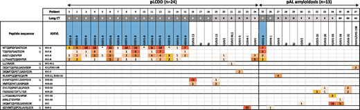 In the past few years, mass spectrometry (MS)-based proteomics has become the gold-standard technique for the classification of amyloidosis from tissue samples.7,8 We have established that this technique is also a reliable tool for the diagnosis of pulmonary LCDD (pLCDD).9 The use of this method has been expanded to the identification of the peptides derived from IGVL genes and gene family with 100% specificity.10,11 Therefore, we designed the present study to investigate IGVL gene usage in a cohort of pLCDD to provide clues about the molecular characteristics of this peculiar disorder.