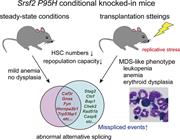 Blood-specific expression of the Srsf2 P95H mutant contributes to the myelodysplastic syndrome phenotype in transplantation settings. May-Grünwald–Giemsa staining of bone marrow cells from Srsf2 P95H mutant–transplanted mice shows dysplastic erythropoiesis. See the article by Kon et al on page 621.