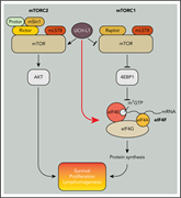 Cells expressing a fusion between a biotin ligase (BioID2) and UCH-L1 were pulsed with biotin and stained with DAPI (4′,6-diamidino-2-phenylindole) (DNA; blue), avidin (Texas red; UCH-L1–associated proteins) and UCH-L1 (Alexa 488; green). Identification of the biotinylated proteins uncovered new roles for UCH-L1 in lymphoma. See the article by Hussain et al on page 2564.