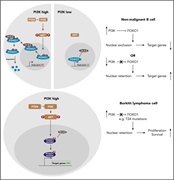 Immunofluorescence staining for FOXO1 expression in murine Burkitt lymphoma (BL) cells (FOXO1 is shown in red; DAPI [4′,6-diamidino-2-phenylindole] labels the nuclei blue). Although phosphoinositide-3-kinase signaling is constantly active in BL cells, FOXO1 escapes nuclear exclusion by gaining genomic mutations. Importantly, proliferation and survival are promoted by nuclear FOXO1 in BL. See the article by Kabrani et al on page 2670.