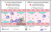 Carestia and colleagues report that mice treated with aspirin have significantly reduced platelet aggregation and neutrophil extracellular trap release during Staphylococcus aureus infection. Furthermore, aspirin reduces intravascular thrombin activity, microvascular occlusion, and organ damage.
