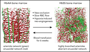 Bone marrow cavity of a humanized sickle cell mouse showing widespread pathologic angiogenesis (arteries and arterioles in green; sinusoids in red) in response to slow red blood cell flow and vaso-occlusions. The distorted neovascular network is completely reversed by a 6-week blood transfusion regimen. See the article by Park et al on page 2071.