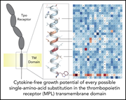 Mutations in the transmembrane domain of the TPO receptor, encoded by exon 10 of the MPL gene, are drivers of a subset of JAK2-negative myeloproliferative neoplasms (MPNs). Bridgford et al used saturation mutagenesis to identify changes in exon 10 associated with cytokine-independent growth, identifying canonical, novel, and cooperating mutations, many of which were subsequently identified in patients with MPNs.