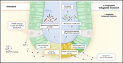 Lysozyme (red)–positive Paneth cells in mice that developed graft-versus-host disease and were treated with the glucagon-like peptide 2 (GLP-2) analog teduglutide. See the article by Norona et al on page 1442.