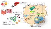 The gut microbiome has become established as a contributor to graft-versus-host disease (GVHD). Using a mouse model, the authors demonstrated that choline-metabolized trimethylamine N-oxide (TMAO) produced in the gut worsens GVHD through activation of the NLRP3 inflammasome and modulation of macrophage polarization. A high-choline diet or TMAO enhances GVHD, which is reversed by inhibition of the NLRP3 inflammasome.