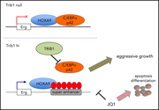 Through a series of studies in mice, Yoshino and colleagues elucidate the interaction of Trib1 and Hoxa9 in leukemogenesis. They demonstrate that Trib1 induces leukemia through degradation of the transcription factor C/EBPα and modification of Hoxa9-associated superenhancers, suggesting Trib1 inhibition as a potential targeted therapy for acute myeloid leukemia.