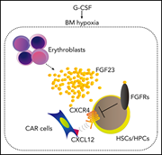 Fibroblast growth factor 23 (FGF-23) is produced by osteocytes and regulates renal phosphate metabolism. Ishii and colleagues elucidate a novel role for FGF-23 in hematopoiesis, demonstrating that it is produced by erythroblasts in response to hypoxia, suppresses erythropoiesis, and increases hematopoietic stem cell mobilization by G-CSF by interfering with migration toward CXCL12.
