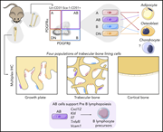 Green et al dissected the bone marrow microenvironmental niche, focusing on skeletal cells and their role in hematopoiesis. They demonstrate that flow cytometry can identify 4 subpopulations, each with a distinct function. The Sca1-CD51+ cells coexpressing platelet-derived growth factor receptor α (PDGFRα) and PDGFRβ are key supporters of B-cell lymphopoiesis in the marrow.