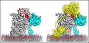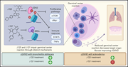 Immunofluorescence image of a splenic germinal center from a mouse with chronic graft-versus-host disease (cGVHD). The section was stained with peanut agglutinin–rhodamine, DAPI (4′-6-diamidino-2-phenylindole), and CD4–fluorescein isothiocyanate. The central red structure shows the germinal center with T-cell (green) areas flanking it. Germinal centers are enlarged in mice with cGVHD and were effectively reduced in both size and frequency with treatment by a novel EZH2 inhibitor, JQ5, and by a BET-bromodomain inhibitor, JQ1. See the article by Zaiken et al on page 2983.
