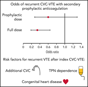 Central venous catheters (CVCs) are a significant risk factor for pediatric venous thromboembolism (VTE). Clark et al performed a retrospective study of 373 patients with VTE to assess the value of secondary prophylaxis in preventing recurrent VTE. Recurrent VTE occurred in 17.4% of patients and was increased in patients with multiple CVC placements, congenital heart disease, and parenteral nutrition dependence. Full-dose, but not prophylactic, anticoagulation reduced recurrence risk by 65%.