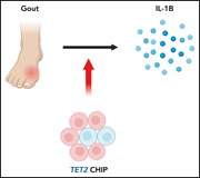 Gout is a common inflammatory arthritis defined by NLRP3 inflammasome– and IL1β-dependent innate immune responses to monosodium urate (MSU) crystals. Agrawal et al identified clonal hematopoiesis of indeterminate potential (CHIP) as a risk factor for gout by analyzing data from 2 large biobanks. In mechanistic studies, they showed that Tet2-knockout mice experienced increased MSU-induced inflammation in an NLRP inflammasome–dependent manner due to the greater production of IL1β by macrophages. These data explain why gout is more common in people with TET2-mutant CHIP.