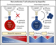 Bispecific antibodies that direct T-cell engagement with malignant blood cells are showing exciting potential in many relapsed hematological malignancies, but their optimal use remains undefined. Philipp et al show for the first time that continuous engagement of T cells by bispecific antibodies leads to their exhaustion, whereas including treatment-free intervals in the schedule helps preserve the fitness of immune effectors and can improve long-term results in model systems. These data call for clinical trials comparing current continuous schedules to ones that include treatment-free intervals.
