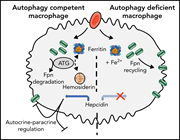 Double immunofluorescence staining of bone marrow–derived macrophages with ferroportin (red) and Atg5 (green) antibodies. Colocalization appears orange-yellow; the nucleus is stained with DAPI (4′,6-diamidino-2-phenylindole; blue). See the article by Taleb et al on page 374.