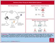 Labrosse et al report on a phase 1/2 trial of stem cell gene therapy for 5 patients with Wiskott-Aldrich syndrome (WAS) using a self-inactivating lentiviral vector expressing the human WAS gene under its autologous promoter. Gene-corrected cells were administered after busulfan/fludarabine conditioning. Clinical results are encouraging, with resolution of eczema, infections, and bleeding in all patients. Correction of thrombocytopenia associates with high transduced copy number. Two patients had recurrent autoimmune flares, which correlate with poor recovery of T cells and regulatory T cells.