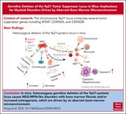 Deletion of chromosome 9p21 is associated with reduced survival in many cancers. Feng et al report that heterozygous deletion of the syntenic region in a mouse model leads to myelodysplastic syndrome/myeloproliferative neoplasm–like disease with marrow fibrosis and/or trabecular bone abnormalities. Using reciprocal transplants, the authors demonstrate that the changes are governed by the marrow microenvironment, highlighting a potential entry point for investigation of targeted therapy for myelofibrosis.