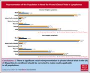 Casey and colleagues examined health disparities in clinical trials in lymphoma. By comparing the demographic and geographic diversity of the populations represented in randomized clinical trials to the US census population reflected in the National Cancer Institute Surveillance, Epidemiology, and End Results Program database, the authors confirmed that there are significant health disparities in clinical trial enrollment that may have an impact on translating clinical trial results to the “real world” US population of patients with lymphoma.