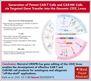 Kath and colleagues present preclinical data for a novel approach to chimeric antigen receptor (CAR)–redirected therapies that avoids viral gene transfer and uses CRISPR-Cas gene editing to insert transgenes into the CD3ζ locus, placing them under physiologic regulation and avoiding the risk of insertional mutagenesis and potential genotoxicity. These novel vectors had equivalent antileukemic activity and have the potential for the development of allogeneic off-the-shelf CAR therapies.