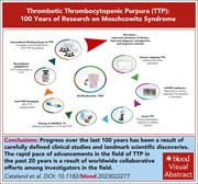 Eli Moschcowitz reported the first case of thrombotic thrombocytopenic purpura (TTP) 100 years ago. In this Special Report, Cataland et al review the remarkable progress in this rare disease that has gone from a fatality rate of 95% to <5%. Moving from clinical observation to scientific discovery that has defined the spectrum of thrombotic microangiopathies, the discovery of the role of the ADAMTS13 protease in immune-mediated and congenital TTP has contributed to successful treatment of almost all patients. Ongoing challenges include the more recent definition of long-term neurocognitive and cardiovascular complications in successfully treated patients.