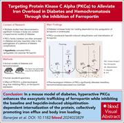 Ferroportin (Fpn), critical for iron homeostasis as the only iron exporter, is downregulated by hepcidin, but other potential regulators remain to be identified. Banerjee et al investigated iron loading in diabetes in murine models and human duodenal specimens, demonstrating that intestinal Fpn was increased in diabetes in a hepcidin-independent manner and that sustained upregulation of Fpn required protein kinase Cα (PKCα). Genetic or pharmacologic abolition of PKC decreased iron loading in both diabetes and hereditary hemochromatosis, supporting PKCα as a novel Fpn regulator and a potential target to reduce iron loading.